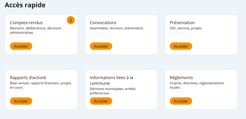 Après connexion, l'utilisateur arrive sur sa page d'accueil. Cette page lui présente un aperçu rapide de toutes les catégories de documents auxquelles il a accès, sous forme de cartes cliquables.